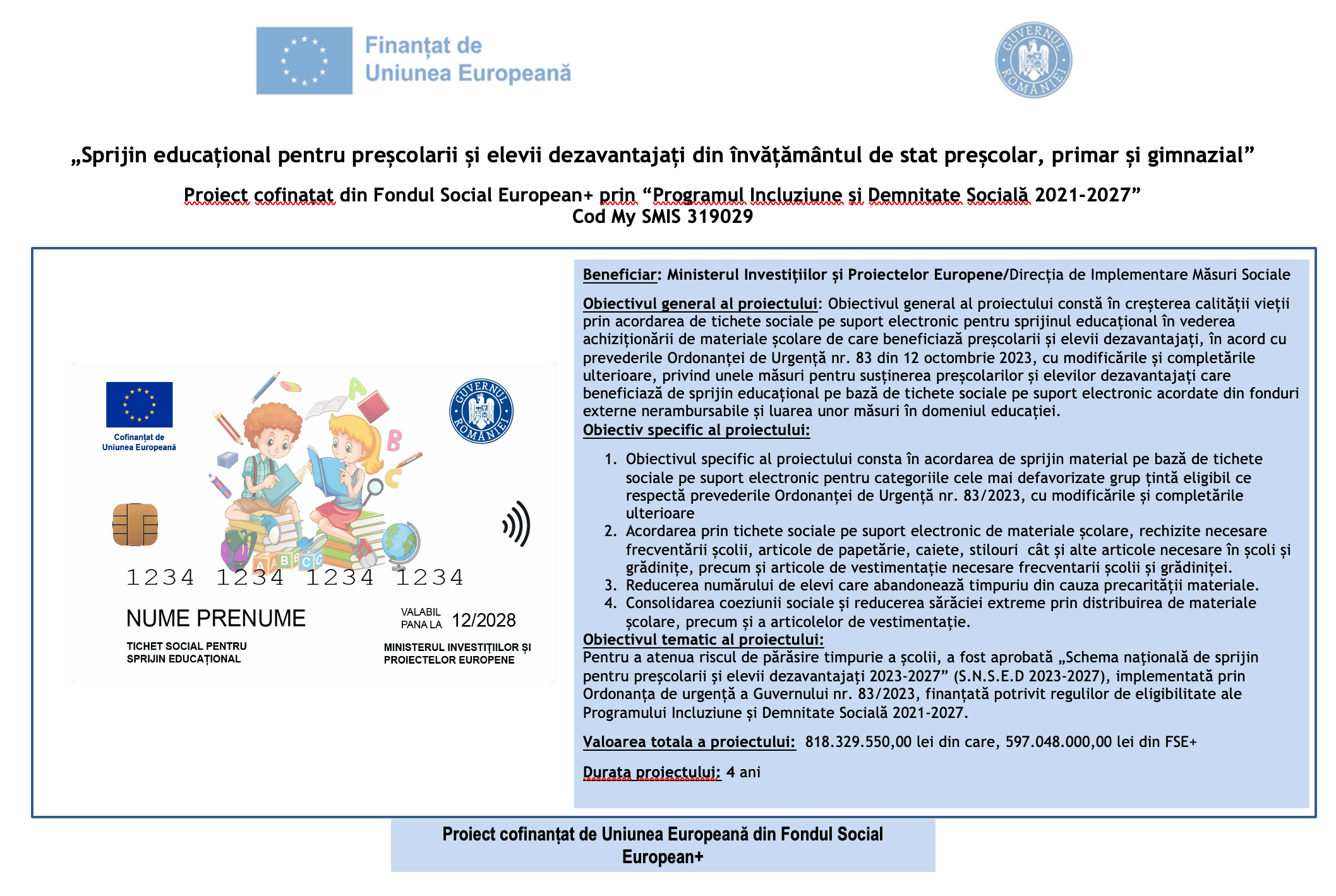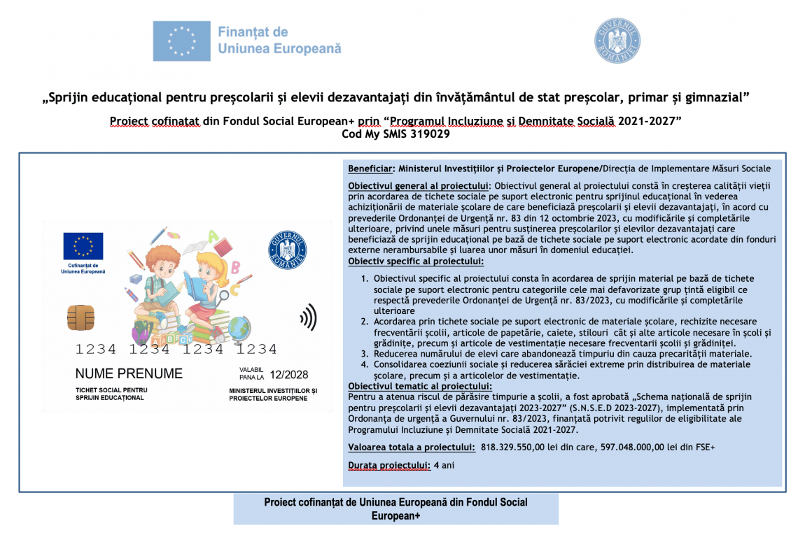 „Sprijin educational pentru prescolarii si elevii dezavantajati din invatamantul de stat prescolar, primar si gimnazial” Proiect cofinatat din Fondul Social European+ prin “Programul Incluziune si Demnitate Sociala 2021-2027”